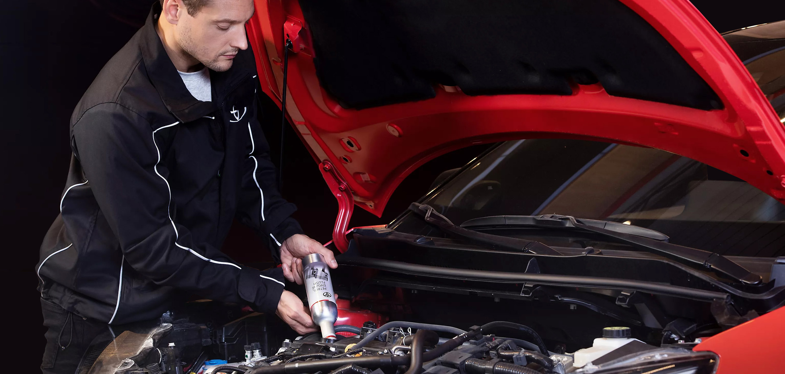 Dzinēja skalošanai mēs izmantojam īpašu Toyota Engine Flush tīrīšanas līdzekli, ko pievieno dzinēja eļļošanas sistēmai pirms eļļas maiņas. Pēc attīrīšanas līdzekļa pievienošanas dzinēju atstāj darbojamies brīvgaitā 10 minūtes, kuru laikā attīrīšanas līdzeklis cirkulē pa visu dzinēju un noņem nogulsnes, kvēpus un uzkrājušos eļļas atlikumus. Izlejot izstrādāto eļļu no dzinēja – kopā ar to tiek izvadīta arī ievērojama daļa dažāda veida nogulsnējumu, kas citādi paliek dzinēja sistēmās un laika gaitā negatīvi ietekmē eļļošanas sistēmas un līdz ar to arī visa dzinēja veiktspēju. Daļa lielāko nogulšņu paliek vecajā degvielas filtrā, kas tiek nomainīts apkopes veikšanas laikā. Rezultātā – jauna eļļa, jauns eļļas filtrs un pirms to nomaiņas – jau attīrīta dzinēja eļļošanas sistēma.