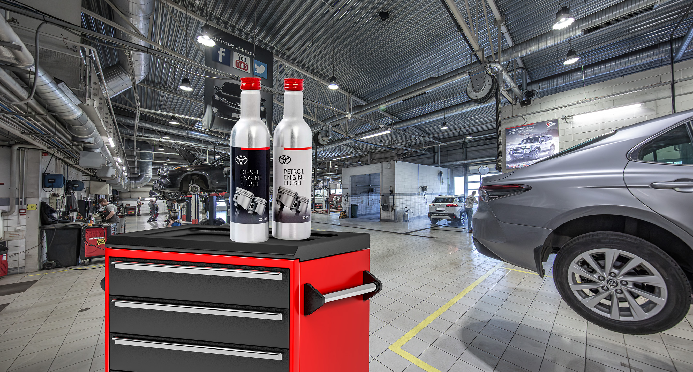 * Dzinēja eļļošanas sistēmas skalošanu ar Toyota Engine Flush var pasūtīt tikai kopā ar plānoto apkopi vai atsevišķu eļļas maiņu. Dzinēja skalošanas tīrīšanas līdzekļa cenā nav iekļautas ar to saistītās darbaspēka izmaksas, kas tiek pievienotas saskaņā ar oficiālo cenrādi. Lai saņemtu precīzu piedāvājumu, lūdzu, sazinies ar AMSERV pārstāvniecību.