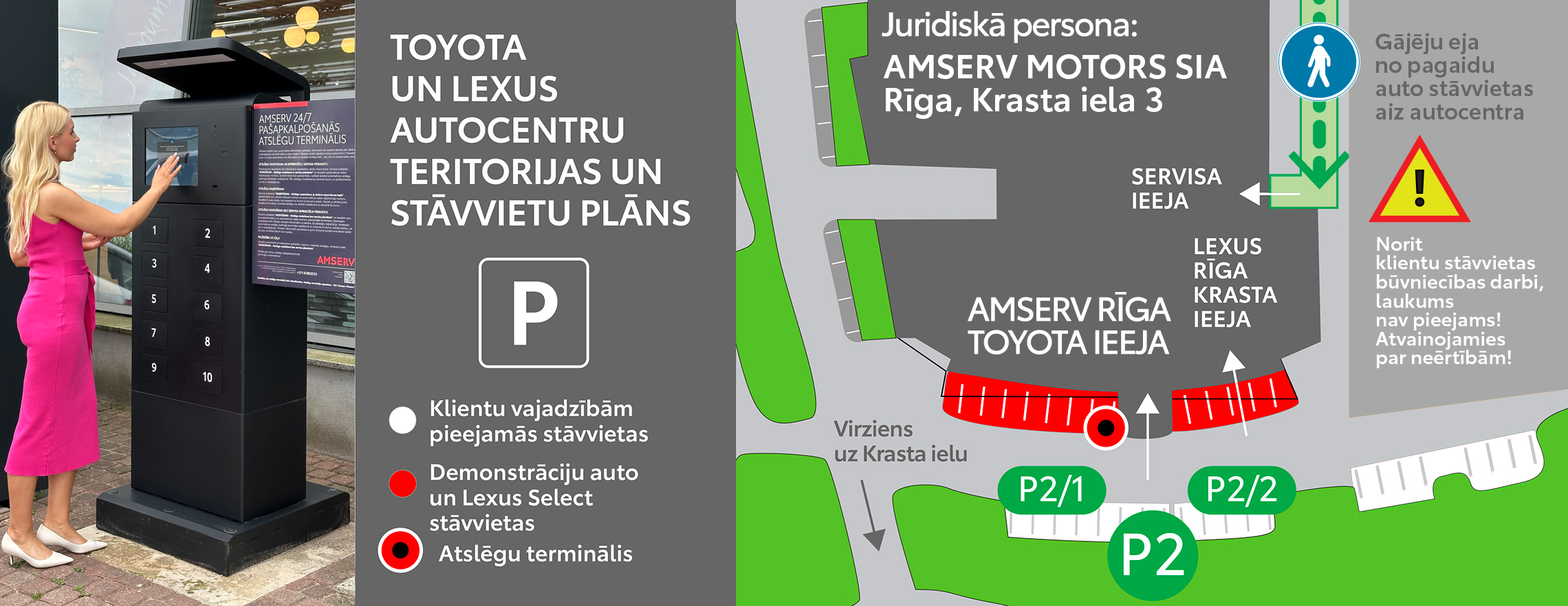 2. Apkalpojamā automašīna ir jānogādā "Amserv" servisā ne vēlāk kā 15 minūtes līdz rezervētajam auto apkalpošanas laikam. Tas jāizdara klātienē ierastajā kārtībā vai arī – izmantojot jauno pakalpojumu – pašapkalpošanās atslēgu termināli, kas pieejams klientiem 24/7.