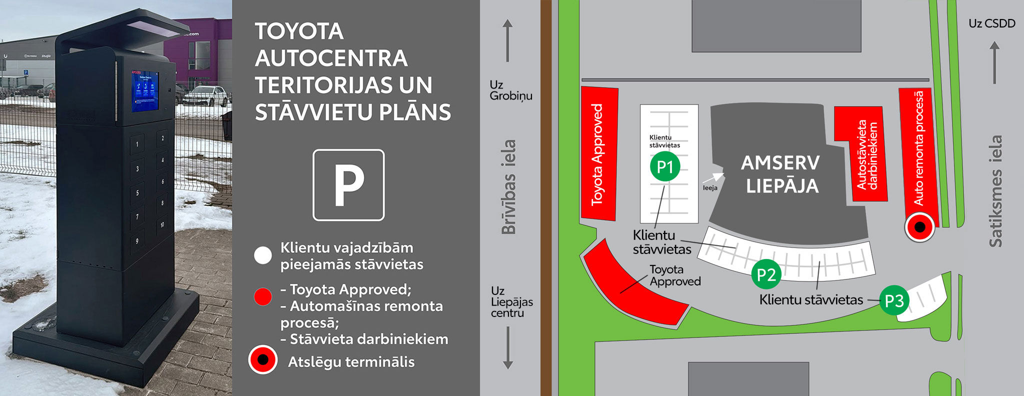 SIA "Amserv Motors" Toyota autocentros – AMSERV RĪGA Rīgā, Krasta ielā 3, un AMSERV LIEPĀJA Liepājā, Brīvības ielā 146b, klientu ērtībām ir pieejams mūsdienīgs pakalpojums – pašapkalpošanās atslēgu terminālis. Uzstādītā iekārta un tās programmnodrošinājums ļauj realizēt servisā apkalpojamo un iznomājamo automašīnu atslēgu nodošanu un saņemšanu bezkontakta veidā visu diennakti visās nedēļas dienās bez darba laika ierobežojumiem. Tagad mūsu klientiem vairs nav jāuztraucas par autocentra darba laiku! Nododiet un saņemiet auto atslēgas sev izdevīgā laikā bez gaidīšanas rindā, nesatraucoties par to, kā varēsiet nokļūt pie mums savas darba dienas laikā.
